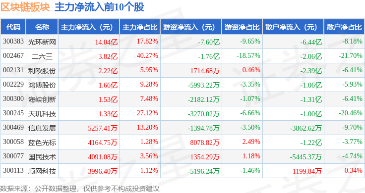 从资金流向上来看,当日区块链板块主力资金净流入5.55亿元,游资资金净流出15.13亿元,散户资金净流入9.57亿元。区块链板块个股资金流向见下表: