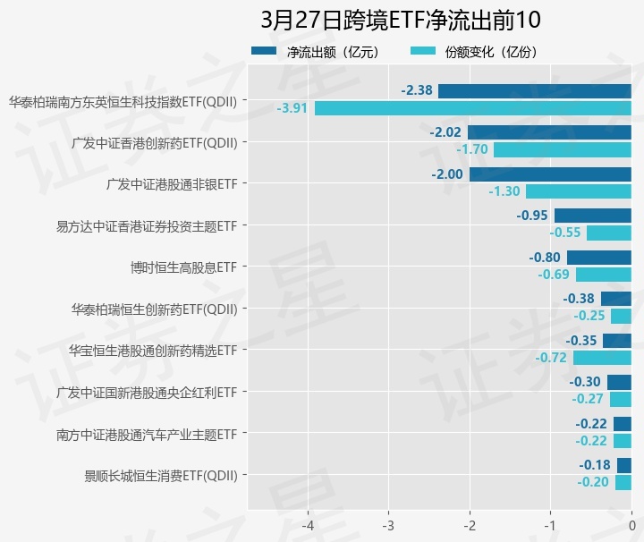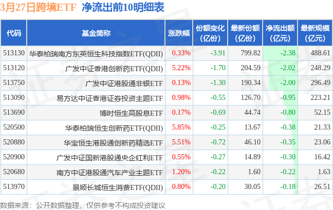 当日有34只跨境ETF基金出现资金净流出,其中净流出排首位的是华泰柏瑞南方东英恒生科技指数ETF(QDII)(513130),份额减少了3.91亿份,净流出额为2.38亿元。