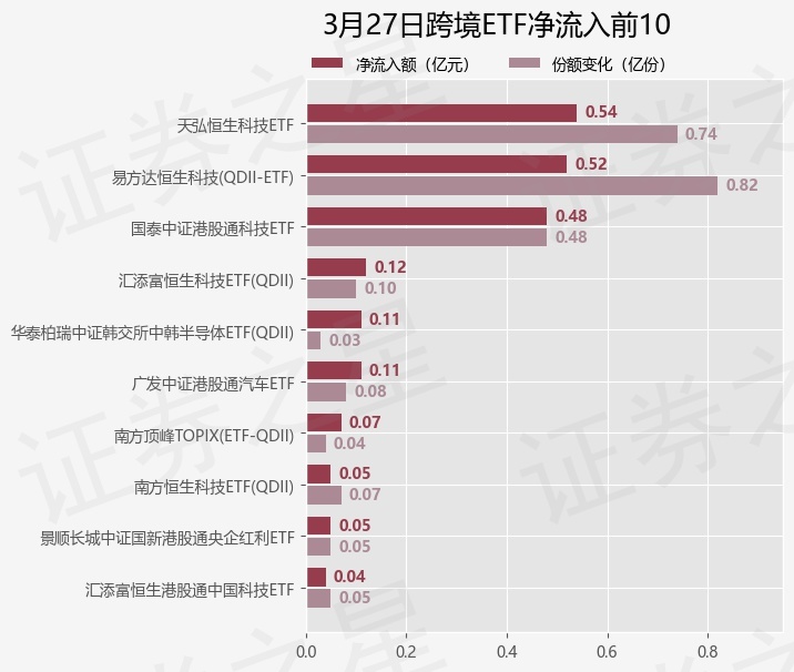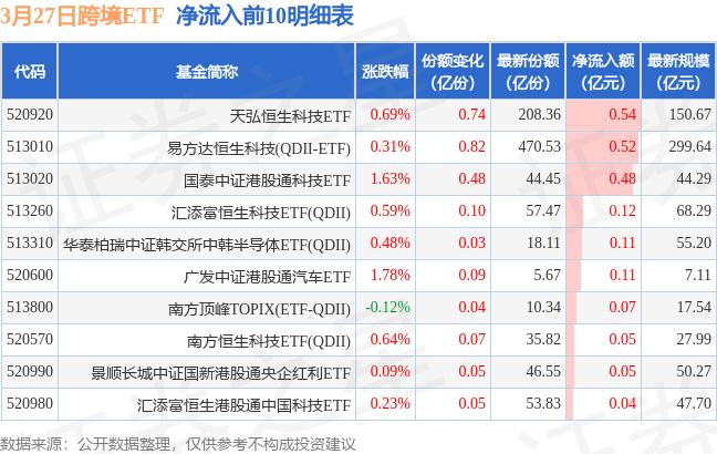 当日有30只跨境ETF基金出现资金净流入,其中净流入排首位的是天弘恒生科技ETF(520920),份额增加了7400.0万份,净流入额为5350.98万元。