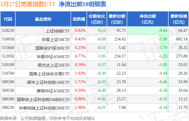当日有50只宽基指数ETF基金出现资金净流出,其中净流出排首位的是上证综指ETF(510210),份额减少了9.21亿份,净流出额为9.04亿元。