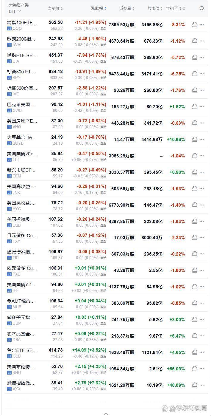 【美股大类资产类ETF涨跌各异,纳指100 ETF收跌超1.9%,布油基金涨超4.2%】周五(3月27日),纳指100 ETF收跌1.95%,罗素2000指数ETF、道指ETF、标普500 ETF至多跌1.80%,巴克莱美国可转债ETF跌1.11%,大豆基金、美国国债20+年ETF、新兴市场ETF、日元做多跌0.70%-0.12%。