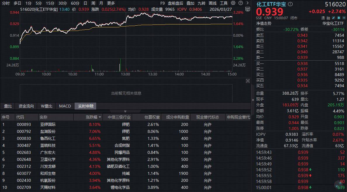 化工板块全线猛攻!反映化工板块整体走势的化工ETF华宝(516020开盘后震荡走高,午后持续高位震荡,盘中场内价格最高涨幅达到3.28%,截至收盘,涨2.74%。