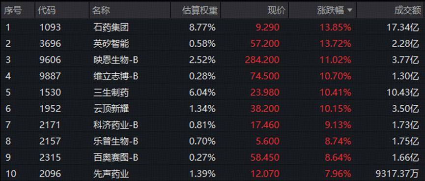港股通创新药ETF华宝(520880)覆盖50家港股上市的创新药研发类公司,成份股涨幅中位数近5%,6股涨幅超10%!权重龙头石药集团疯涨13.85%,三生制药涨10.41%,英矽智能、维立志博-B等本月纳入成份股的新入通标的联袂飙涨逾10%