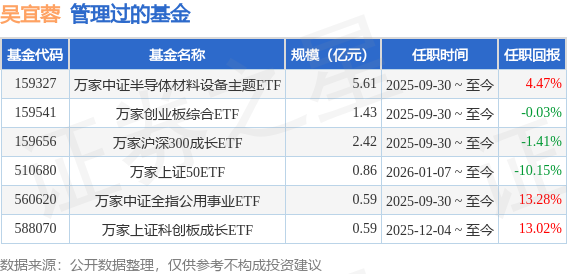 吴宜蓉女士:中国国籍,研究生、硕士。曾任东方财富信息股份有限公司集团分析部分析师,平安资产管理有限公司AI实验室模型工程师,华宝基金管理有限公司指数研发投资部研究员、基金经理助理等职。2025年7月入职万家基金管理有限公司,现任量化投资部基金经理。2025年9月30日担任万家中证半导体材料设备主题交易型开放式指数证券投资基金、万家沪深300成长交易型开放式指数证券投资基金、万家创业板综合交易型开放式指数证券投资基金、万家中证全指公用事业交易型开放式指数证券投资基金基金经理。2025年12月4日担任万家上证科创板成长交易型开放式指数证券投资基金基金经理。2026年1月7日担任万家上证50交易型开放式指数证券投资基金基金经理。