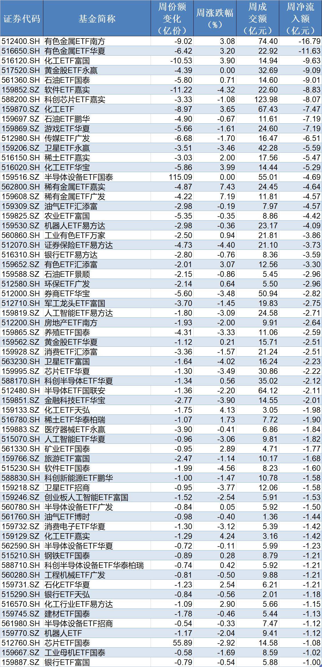 在资金流出方面,本周有65只行业主题ETF净流出逾1亿元,其中有色金属ETF南方、有色金属ETF华夏、化工ETF富国份额分别减少9.02亿份、6.42亿份和10.53亿份,分别净流出资金16.79亿元、11.63亿元和9.63亿元。
