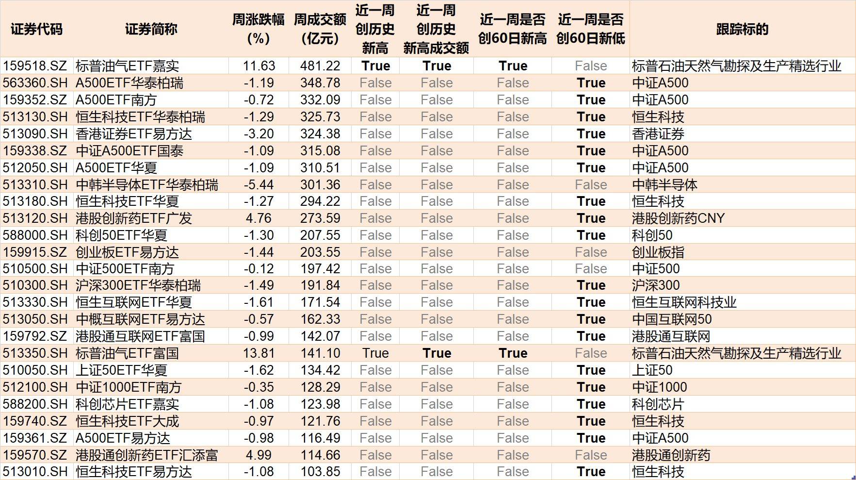 本周,股票型ETF和跨境型ETF成交额超100亿元的ETF有25只。其中,标普油气ETF嘉实周成交额超400亿元。