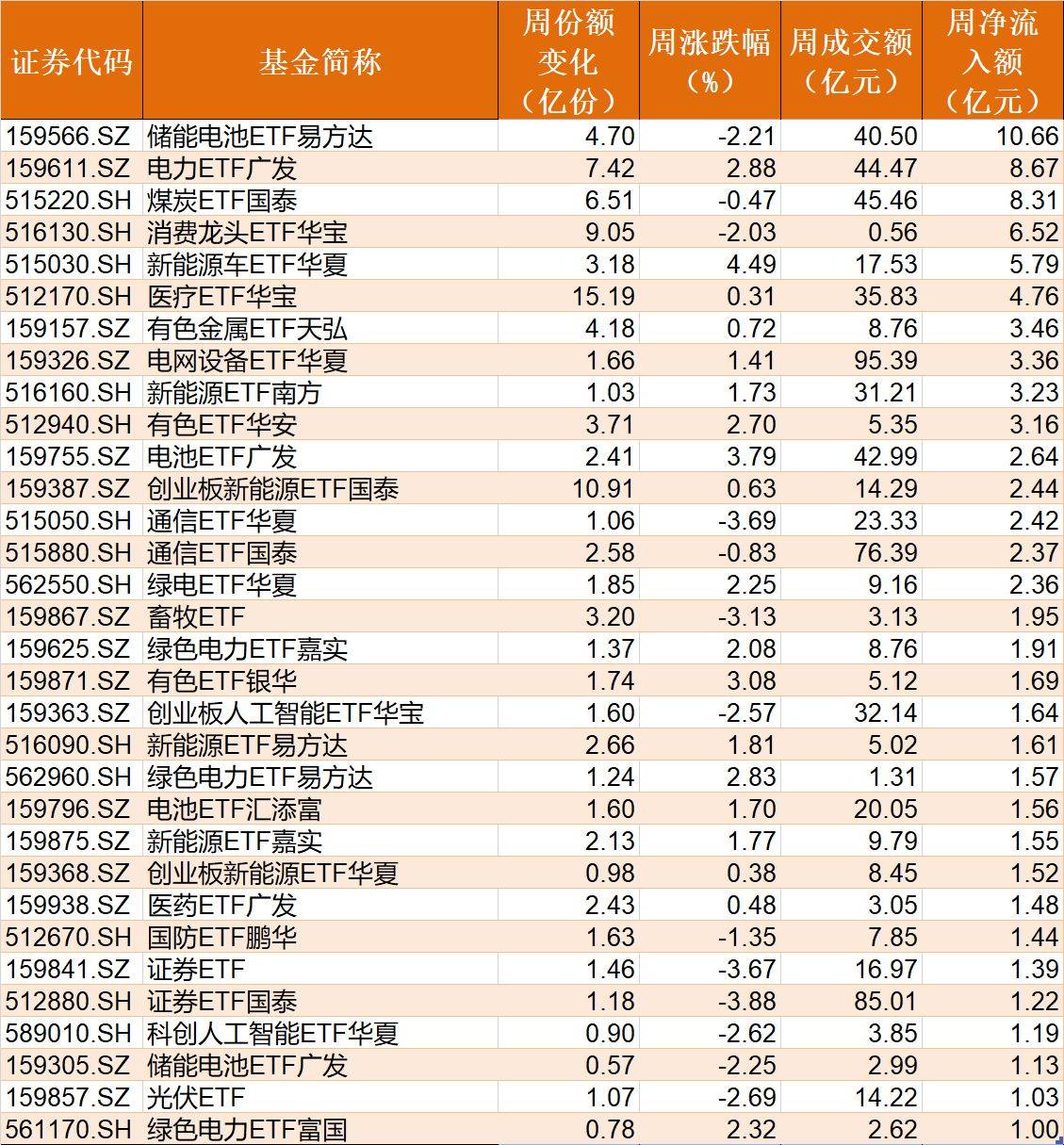 在行业主题ETF方面,本周净流入资金超1亿元的基金有32只,其中储能电池ETF易方达、电力ETF广发、煤炭ETF国泰份额分别增加了4.7亿份、7.42亿份和6.51亿份,净流入资金10.66亿元、8.67亿元和8.31亿元。