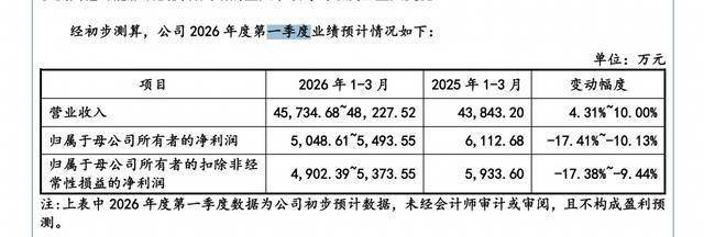 2026年度第一季度,千岸科技预计营业收入为4.57亿元至4.82亿元,同比增长4.31%至10%;归属于母公司所有者的净利润5048.61万元至5493.55万元,同比减少17.41%至10.13%;归属于母公司所有者的扣除非经常性损益的净利润4902.39万元至5373.55万元,同比减少17.38%至9.44%。