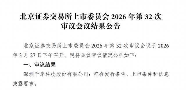 瑞财经 刘治颖 3月27日,据北交所,深圳千岸科技股份有限公司(以下简称:千岸科技)符合发行条件、上市条件和信息披露要求。