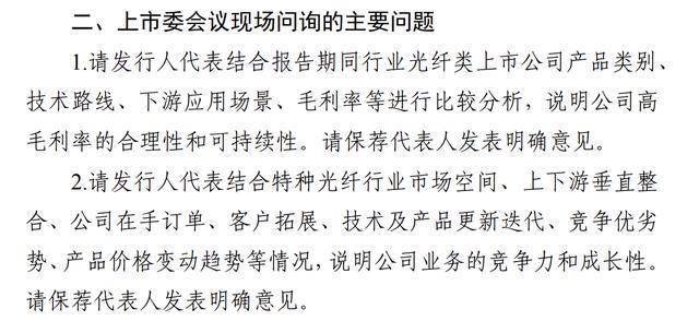 上市委会议现场,上交所要求长进光子结合报告期同行业光纤类上市公司产品类别、技术路线、下游应用场景、毛利率等进行比较分析,说明公司高毛利率的合理性和可持续性。