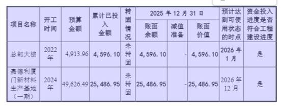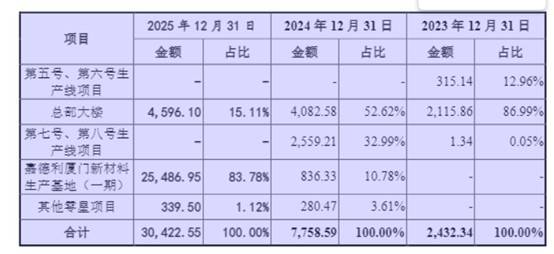 但诡异的是,这份高调的扩产计划,并未及时体现在嘉德利的财务披露中。直到2025年,嘉德利的在建工程明细里才首次出现“嘉德利新建厦门新材料生产基地(一期)”项目,该基地恰好包含了此前高调招标的9、10号生产线。