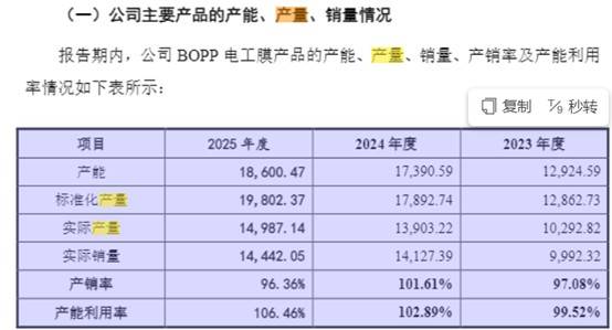 到了2025年,情况发生反转。这一年,嘉德利固定资产从3.41亿元猛增至6.20亿元,增幅达82%;在建工程从0.78亿元增至3.44亿元,增幅达341%。公司称,新增固定资产主要来自7、8号超薄BOPP项目的转固,看似是产能大幅扩张的信号。但公司2025年标准化产能仅从1.79万吨增至1.98万吨,增幅仅10.6%,与资产增幅形成巨大“剪刀差”。