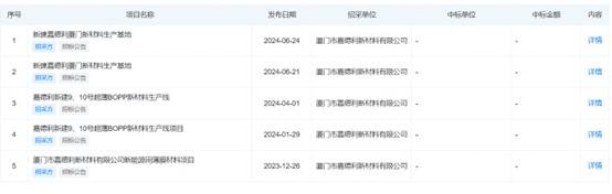 多条产线同时在建,进一步加剧了产能迷雾。这一切,要从嘉德利唯一全资子公司——厦门市嘉德利新材料有限公司说起。天眼查显示,2023年底,该子公司在厦门市海沧区购入一块5.88公顷的工业用地。2024年1月,该子公司高调发布“嘉德利新建9、10号超薄BOPP新材料生产线”招标公告;同年6月,又紧接着发布“新建嘉德利厦门新材料生产基地”。