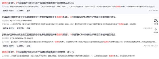 更令人不解的是7、8号生产线与9、10号生产线的招标、环评及在建工程披露时间线完全脱节。公开信息显示,嘉德利直到2024年8月,才启动7、8号超薄BOPP新材料生产线项目的招标工作,随后经过两次环评公示,直到2025年1月16日,该项目才正式获得环评批准公示。但在2024年底的在建工程明细中,嘉德利已经披露包含了7、8号产线账面余额2559万元。