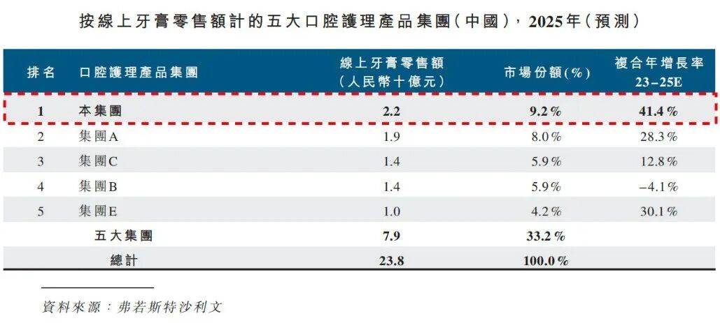 弗若斯特沙利文数据佐证了小阔集团的市场地位。按2025年零售额计算,小阔集团在中国口腔护理产品市场排名第三,市场份额6.5%,与第二名仅相差0.2%。2023至2025年零售额复合增长率达到73.2%,在行业前五大集团中排名第一。