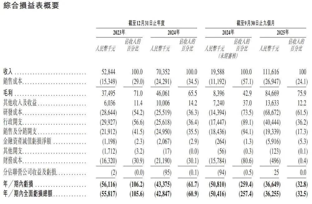 目前公司尚未盈利,但亏损正在收窄。2023年、2024年和2025年前九个月,净亏损分别为5611.6万元、4337.5万元和3664.9万元。