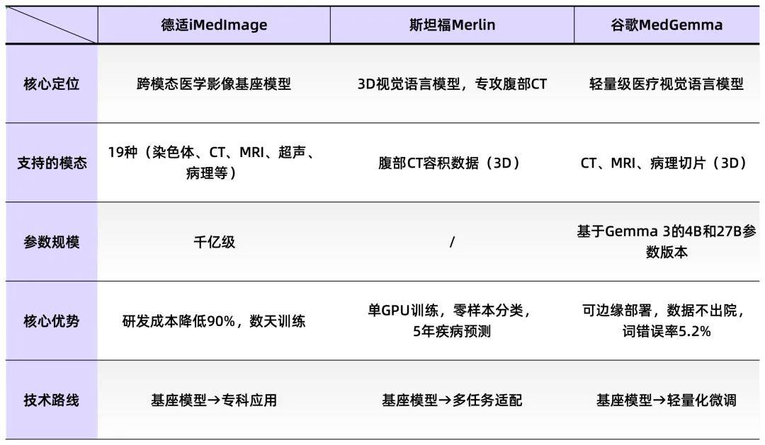 从技术路径看,以基座模型为核心的路径正在兴起。其基本思路是先训练具备通用能力的基础模型,再通过相对少量的数据完成对具体任务的适配。德适生物的iMedImage以及斯坦福今年1月发布的Merlin、谷歌的MedGemma,走的正是同一条技术路线。
