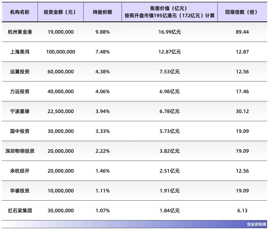 上市后,杭州紫金港、上海美鸿、远翼投资、力远投资、宁波嘉缘、国中投资、深圳物明投资、余杭经开、华睿投资、红石梁集团分别持股9.88%、7.48%、4.38%、4.06%、3.94%、3.33%、2.22%、1.46%、1.11%、1.07%。