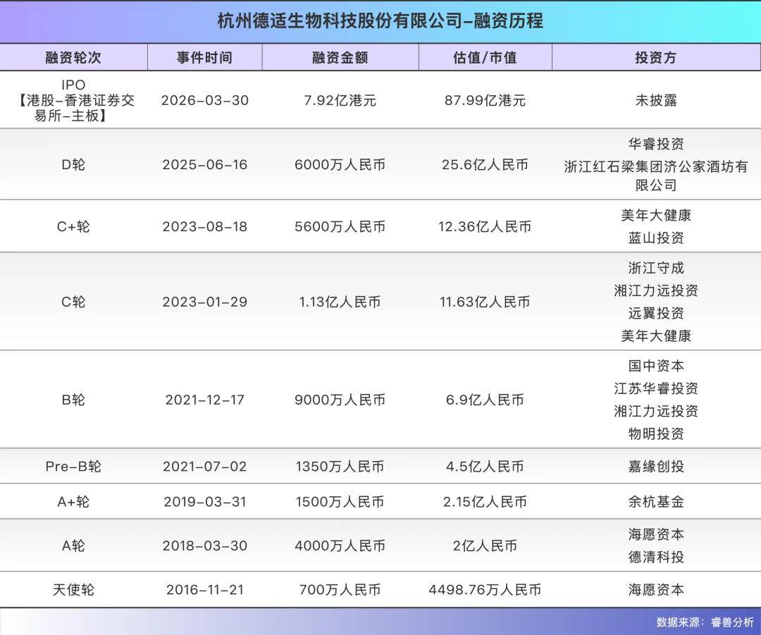 从2016年成立至今,德适生物完成了多轮融资,股东名单中包括杭州紫金港、上海美鸿、远翼投资、力远投资、宁波嘉缘、国中投资、深圳物明投资、余杭经开、华睿投资、红石梁集团等机构。