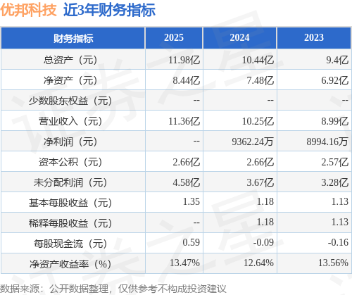 从目前公布的财报来看,优邦科技2025年总资产为11.98亿元,净资产为8.44亿元;近3年净利润分别为nan元(2025年),9362.24万元(2024年),8994.16万元(2023年)。详情见下表: