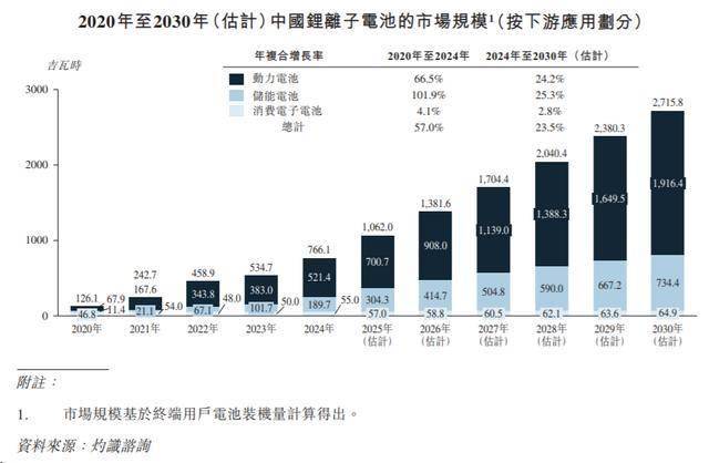 预计中国锂离子电池市场规模于2020年至2030年将维持强劲增长,动力电池有望成为主要增长动力,市场规模由2020年的67.9吉瓦时增长至2024年的521.4吉瓦时,并于2030年进一步达到1916.4吉瓦时。储能电池预计也将经历快速扩张,从2020年的46.8吉瓦时增至2024年的189.7吉瓦时,并于2030年增至734.4吉瓦时,从而成为整体锂离子电池需求的重要新贡献者。