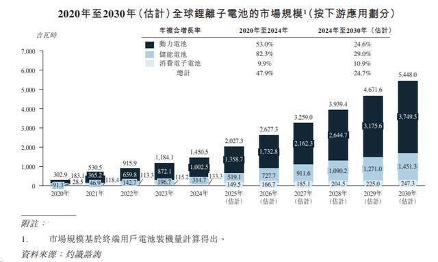 全球锂离子电池市场在2020年至2024年间呈现爆发式增长,市场规模由2020年的302.9吉瓦时快速攀升至2024年的1450.5吉瓦时,年复合增长率达47.9%。随著全球能源转型,锂离子电池市场预期将持续扩张。全球锂离子电池市场规模预计将于2030年达到5448.0吉瓦时,自2024年至2030年的年复合增长率将达24.7%。这一增长主要受各交通领域电气化(包括乘用车、商用车、船舶和机械)、可再生能源储能需求增加以及消费电子设备广泛普及的推动。