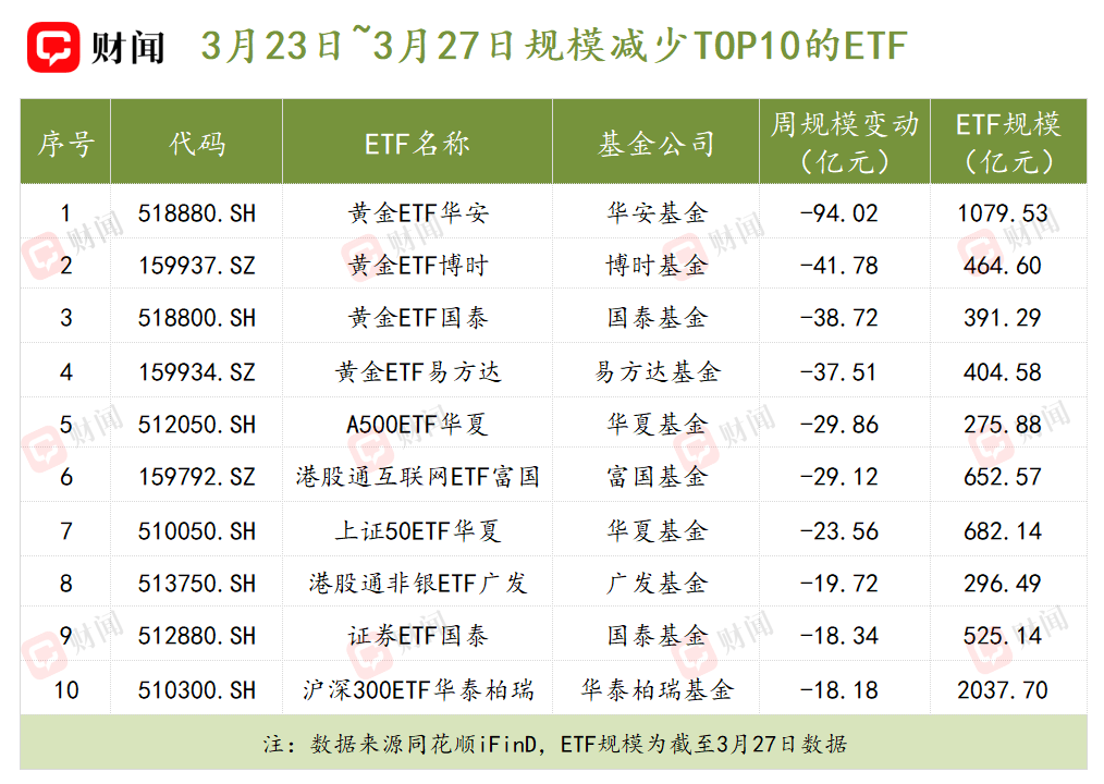 相比之下,商品型黄金ETF上周经历了集体规模下滑。黄金ETF华安、黄金ETF博时、黄金ETF国泰、黄金ETF易方达规模缩水金额位居全市场前四,规模分别减少94.02亿元、41.78亿元、38.72亿元和37.51亿元。