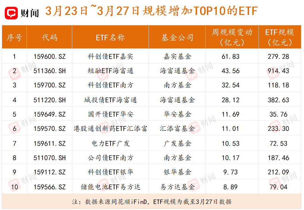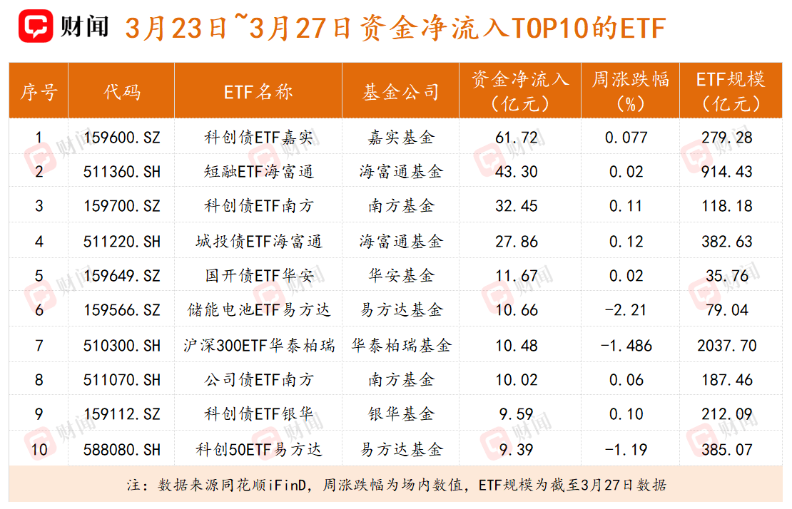 上周资金净流入前五的ETF分别为科创债ETF嘉实、短融ETF海富通、科创债ETF南方、城投债ETF海富通以及国开债ETF华安,净流入金额分别为61.72亿元、43.30亿元、32.45亿元、27.86亿元和11.67亿元。