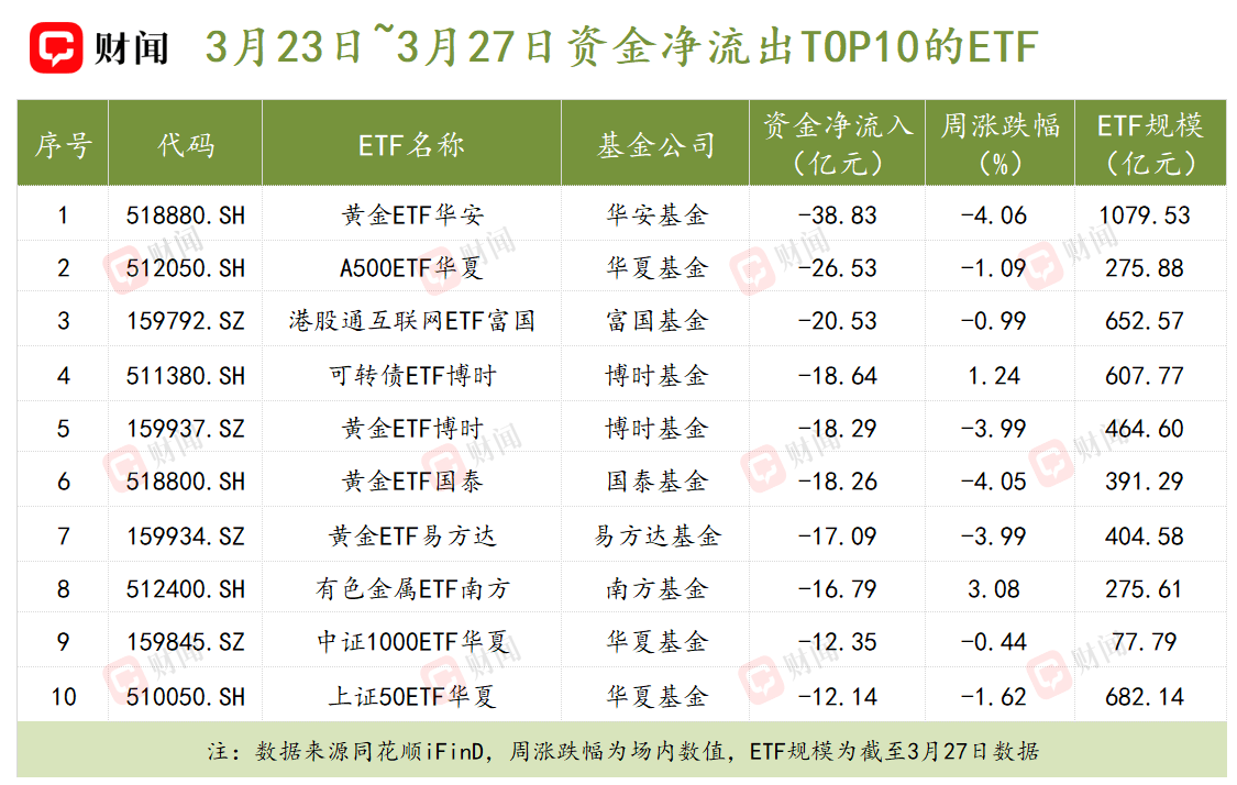 相应地,高风险的商品及股票型ETF位居资金净流出前列。其中黄金ETF华安资金净流出金额38.83亿元,是当周市场资金净流出规模最大的产品。