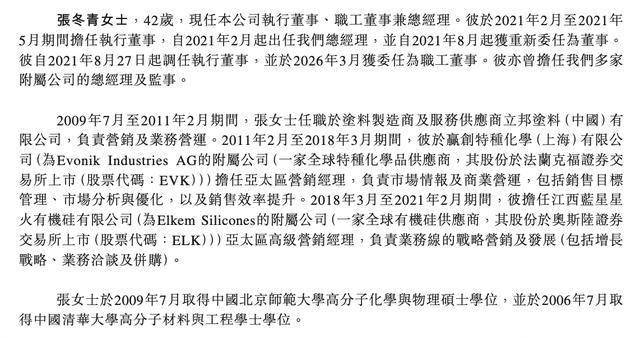2009年7月至2011年2月期间,张冬青任职于涂料制造商及服务供应商立邦涂料(中国)有限公司,负责营销及业务营运。2011年2月至2018年3月期间,其于赢创特种化学(上海)有限公司担任亚太区营销经理,负责市场情报及商业营运,包括销售目标管理、市场分析与优化,以及销售效率提升。2018年3月至2021年2月期间,其担任江西蓝星星火有机硅有限公司亚太区高级营销经理,负责业务线的战略营销及发展(包括增长战略、业务洽谈及并购)。
