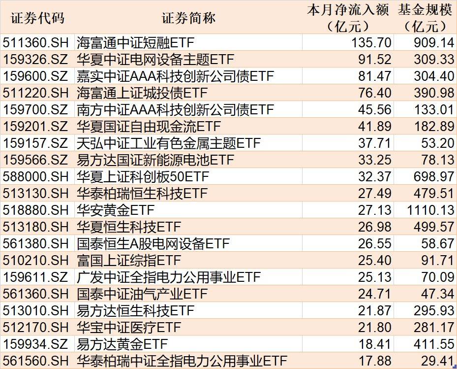 截至3月30日,本月资金净流入额居前20的ETF名单如下: