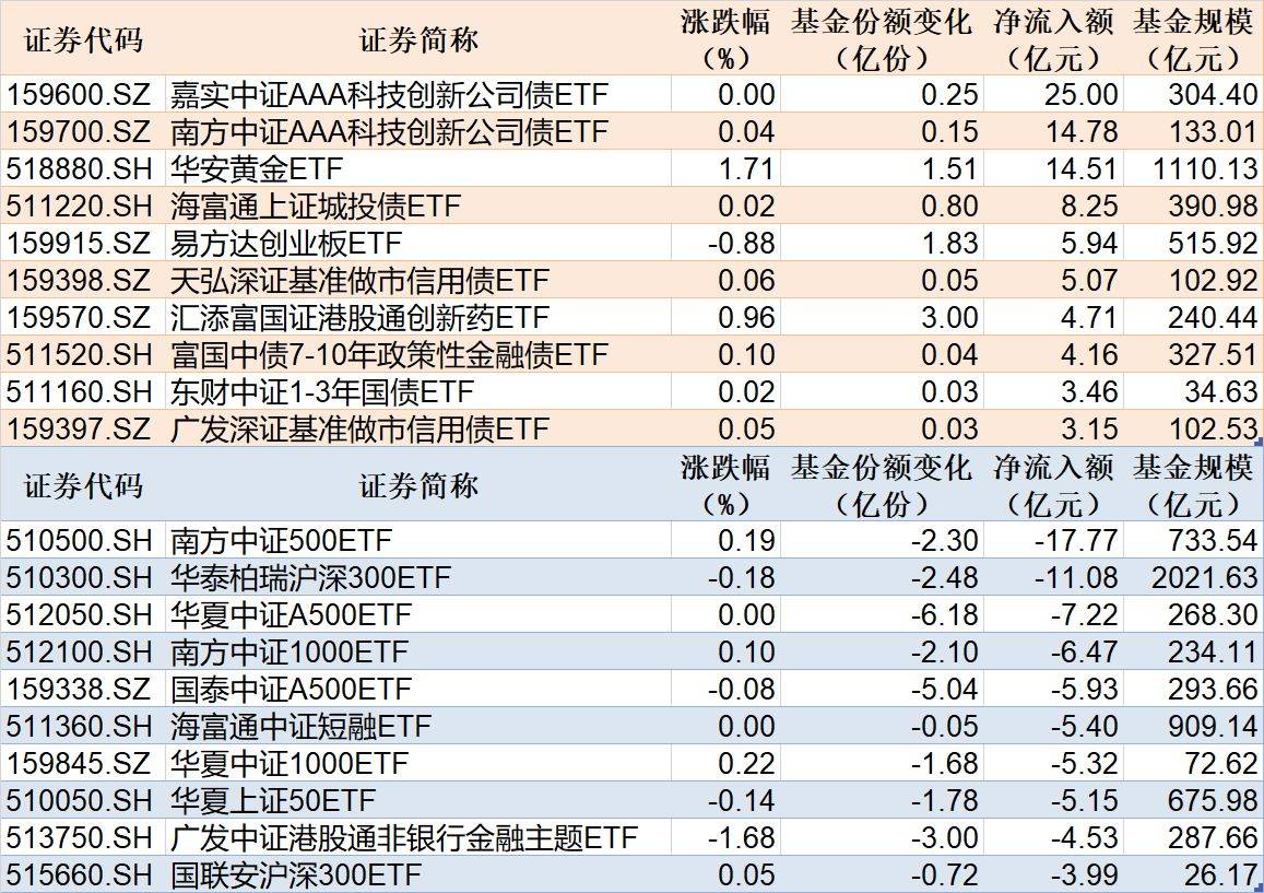 与此同时,南方中证500ETF基金份额减少2.30亿份,净流出额17.77亿元;华泰柏瑞沪深300ETF基金份额减少2.48亿份,净流出额11.08亿元;华夏中证A500ETF基金份额减少6.18亿份,净流出额7.22亿元。