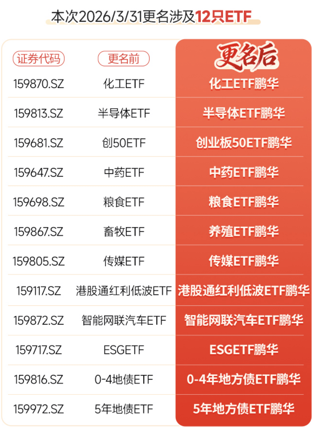 2026年3月31日,鹏华基金12只深交所ETF完成场内简称变更,至此,鹏华基金旗下69只ETF基金产品全部完成更名,均实现了规范化命名。