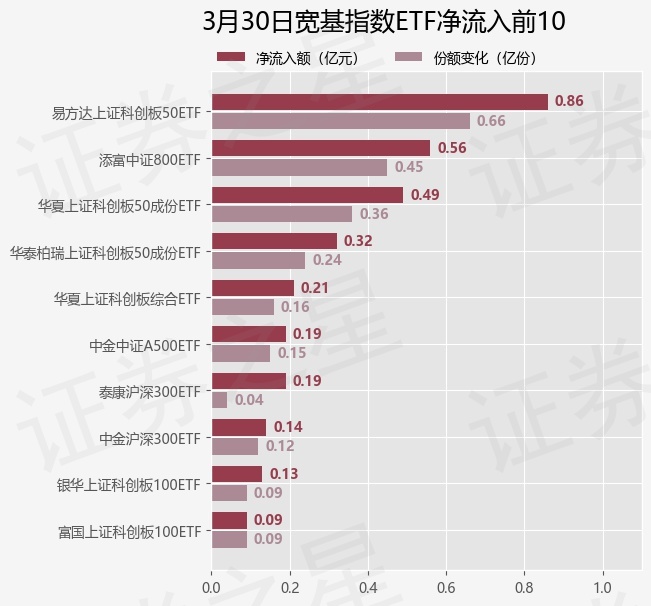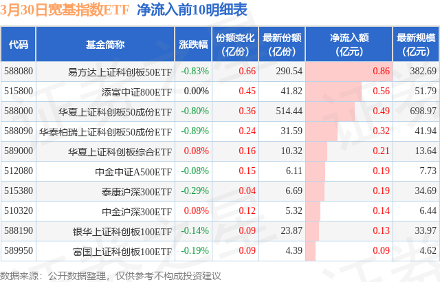 当日有20只宽基指数ETF基金出现资金净流入,其中净流入排首位的是易方达上证科创板50ETF(588080),份额增加了6600.0万份,净流入额为8644.74万元。