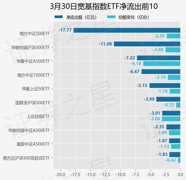 当日有70只宽基指数ETF基金出现资金净流出,其中净流出排首位的是南方中证500ETF(510500),份额减少了2.3亿份,净流出额为17.77亿元。