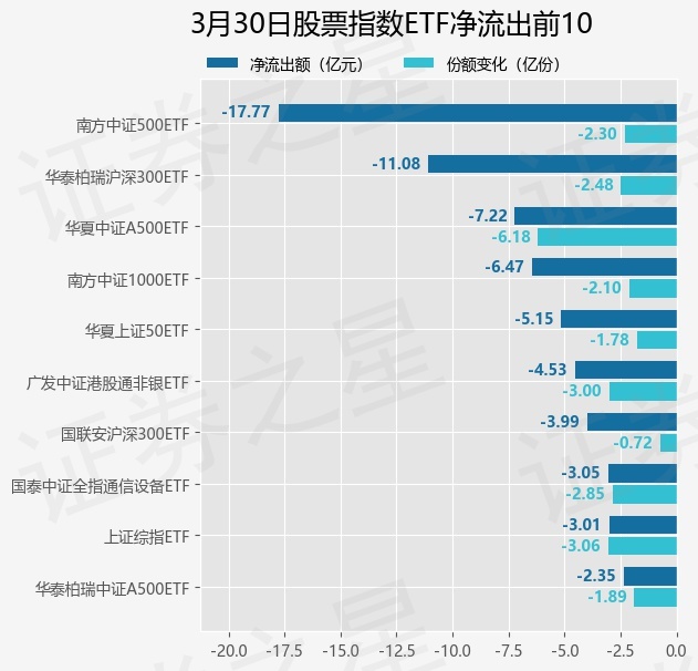 当日有250只股票指数ETF基金出现资金净流出,其中净流出排首位的是南方中证500ETF(510500),份额减少了2.3亿份,净流出额为17.77亿元。