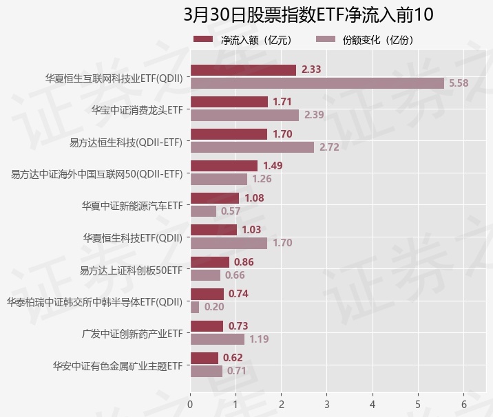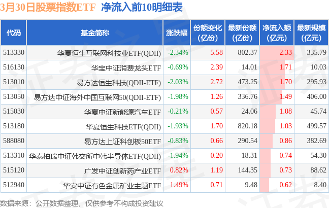 当日有156只股票指数ETF基金出现资金净流入,其中净流入排首位的是华夏恒生互联网科技业ETF(QDII)(513330),份额增加了5.58亿份,净流入额为2.33亿元。