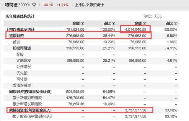 直接融资中,特锐德于2009年10月登陆A股时,首发募资净额为7.79亿元。截至3月4日收盘,特锐德A股报收30.12元/股,市值317.93亿元。