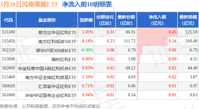 当日有8只风格策略ETF基金出现资金净流入,其中净流入排首位的是易方达中证红利ETF(515180),份额增加了3100.0万份,净流入额为4463.3万元。
