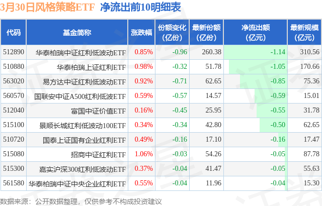 当日有15只风格策略ETF基金出现资金净流出,其中净流出排首位的是华泰柏瑞中证红利低波动ETF(512890),份额减少了9600.0万份,净流出额为1.14亿元。