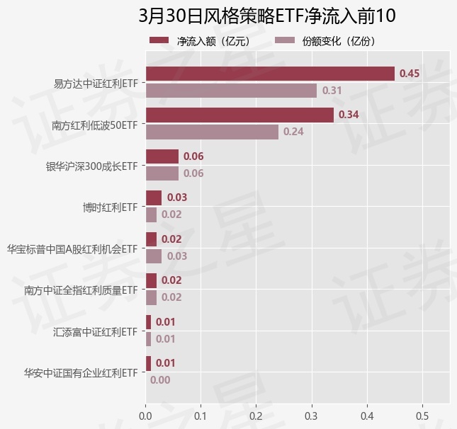 证券之星消息,3月30日风格策略ETF基金合计资金净流出4.13亿元,近5个交易日累计净流入10.77亿元,5个交易日中出现日合计资金净流入的有3天(ETF资金流向计算公式:(当日ETF场内流通份额-前一交易日ETF场内流通份额)*当日ETF均价,计算结果仅供参考)。