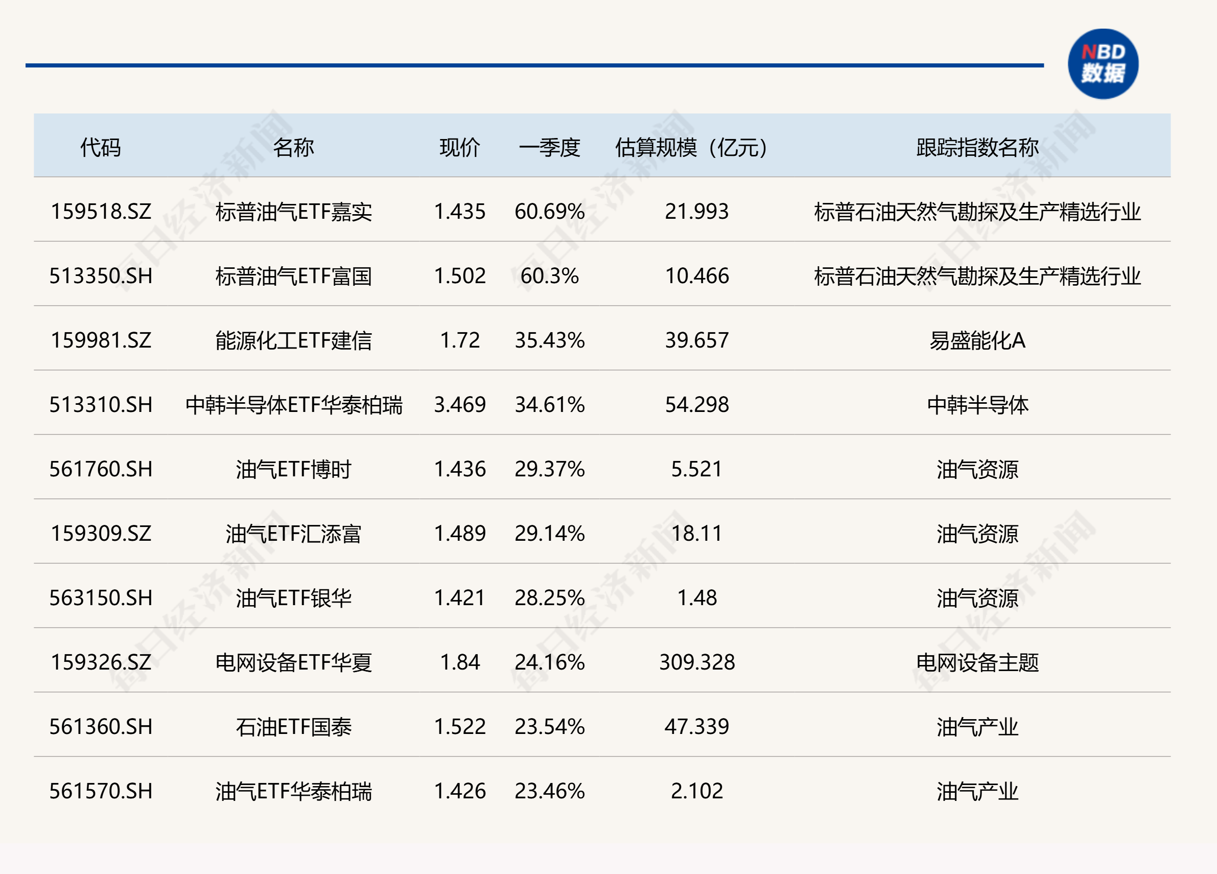 ETF方面,2只标普油气相关ETF一季度累计涨幅超60%,能源化工ETF建信、中韩半导体ETF华泰柏瑞紧随其后,累计涨幅超34%。