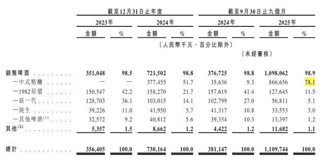 真正的转折点出现在2022年底——公司正式转向精酿赛道。2024年8月推出的“金星毛尖”,将信阳毛尖融入啤酒工艺,定价约20元/瓶(1L装),上市首日销量达6吨,10个月内突破1亿罐。截至2025年9月30日,中式精酿已扩展至50个SKU,贡献了公司当期78.1%的收入。从泥足深陷到逆风翻盘,金星用一杯茶啤完成了一次堪称教科书式的自救。