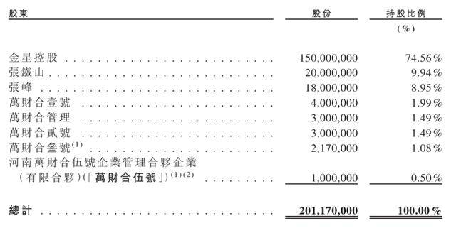 金星啤酒为张氏父子100%绝对控股,股权高度集中、治理结构高度家族化。招股书明确,截至最后实际可行日期,张铁山、张峰父子及关联主体合计持有公司100%权益:金星控股(张铁山90%、张峰10%)持股74.56%;张铁山直接持股9.94%;张峰直接持股8.95%;张峰通过万财合壹号、万财合管理、万财合贰号、万财合叁号、万财合伍号五家员工持股平台,合计控制6.55%权益。