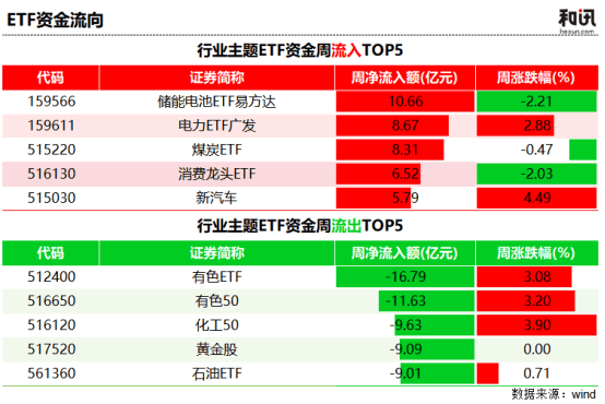 进攻端,储能电池、新能源、电力等板块获得资金布局。储能电池ETF易方达本周净流入10.66亿元,电力ETF广发净流入8.67亿元,周涨幅达2.88%,表现出量价齐升态势。有券商分析认为,高油价背景下新能源经济性优势凸显,储能、风电高景气度有望延续。