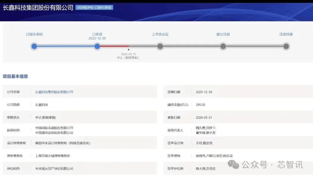 2026年3月31日,根据上交所官网披露的信息显示,长鑫科技集团股份有限公司(以下简称“长鑫科技”)科创板IPO中止,原因为财务资料已过有效期。
