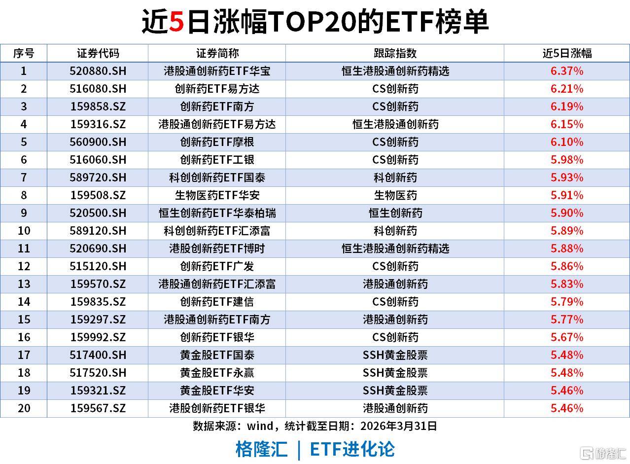 科创新药、港股通创新药、恒生创新药等相关ETF批量录得5.46%-6.37%涨幅,医药创新赛道行情集中演绎;黄金股系列ETF同步走强,涨幅在5.46%-5.48%区间,避险属性资产获资金跟进配置,形成“医药成长+黄金避险”的中期双主线格局。
