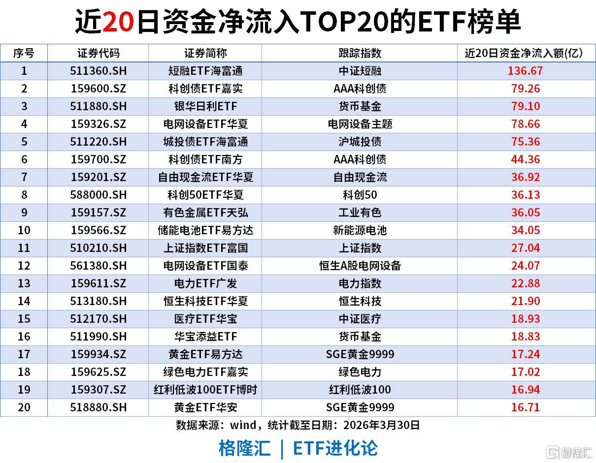 固收与货币:短融ETF海富通、银华日利ETF等货币、短融类资产合计流入超170亿,提供稳定配置基础。