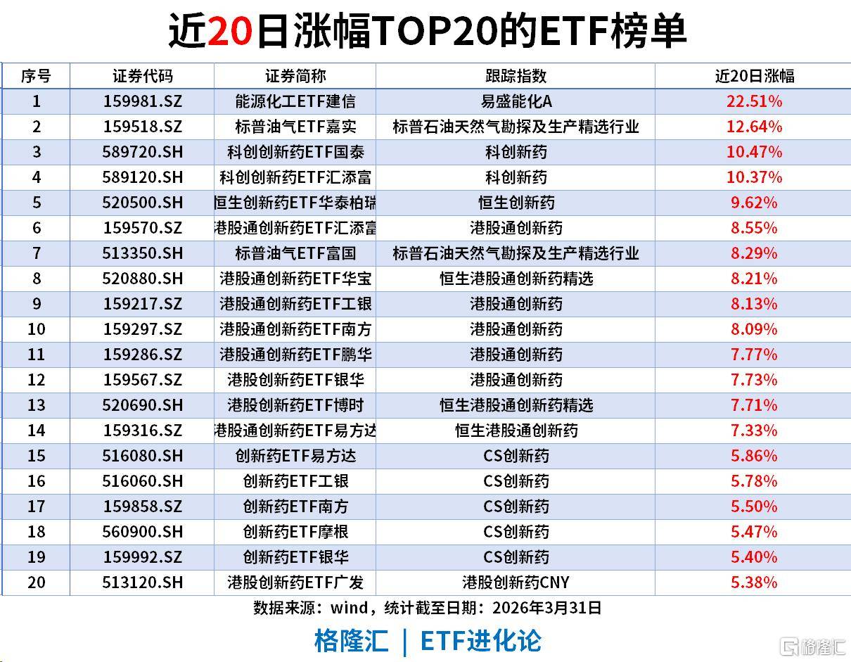 能源化工ETF建信、标普油气ETF嘉实、标普油气ETF富国包揽前三,涨幅分别达22.51%、12.64%、8.29%,能源品中期行情一骑绝尘,地缘冲突驱动的能源行情持续深化。