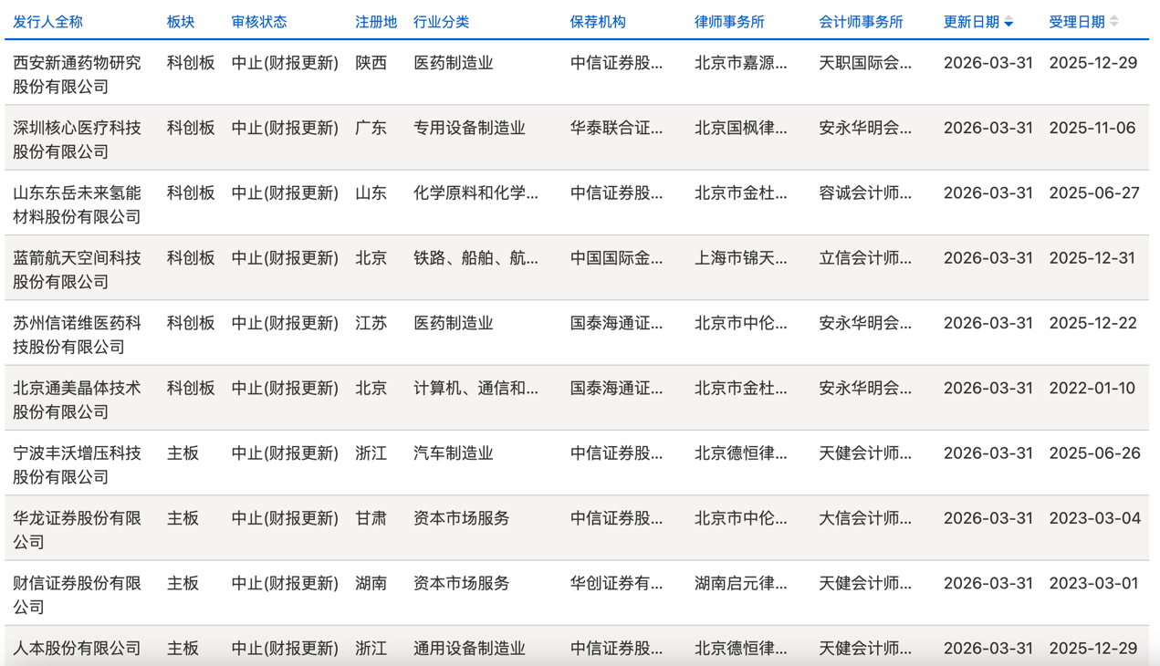 3月31日,上交所官网显示,共计27家企业IPO审核状态更新为“中止(财报更新)”,其中包括蓝箭航天、长鑫科技、上海超硅、新通药物、国仪量子等公司。